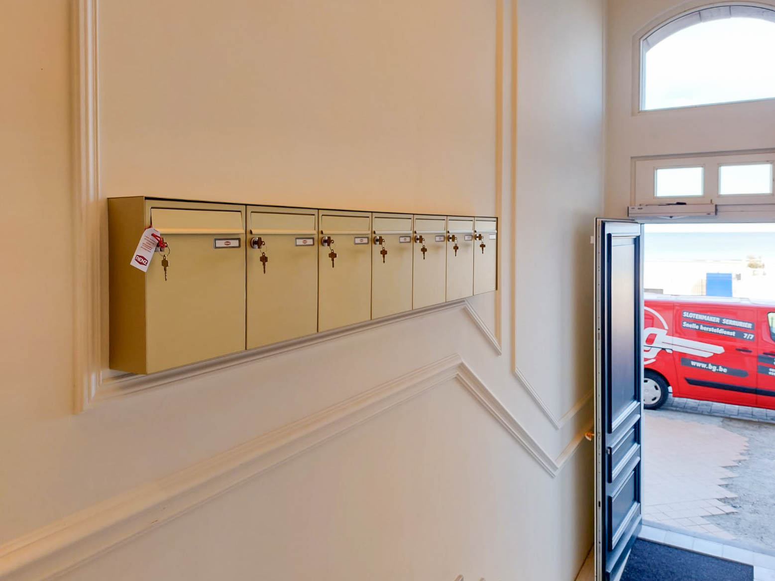 In de inkomhal van Troon 17 in Oostende geven Renz brievenbussen in een warme, goudkleurige afwerking de ruimte een verzorgde en elegante uitstraling. Brievenbussen zijn misschien klein, maar ze bepalen mee hoe een hal aanvoelt. Dankzij het uniforme ontwerp oogt de ruimte netjes en overzichtelijk, terwijl de goudkleur een subtiel luxueus accent toevoegt.